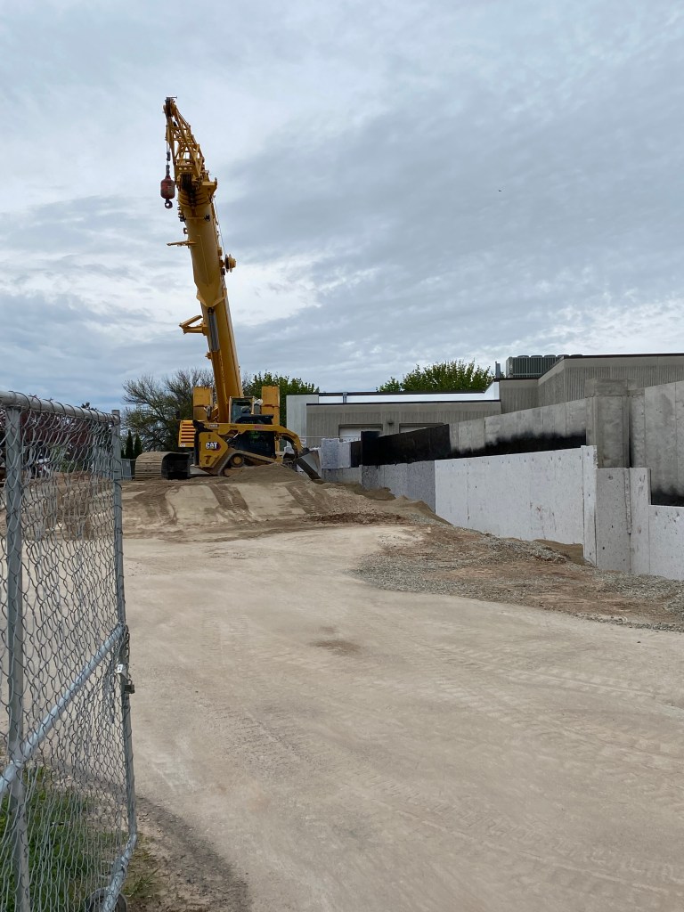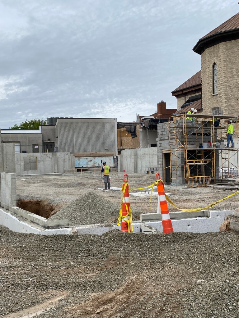 Construction on the new Parish Center has been going well, and we have been very pleased thus far with the efforts of Hoffman and the various subcontractors. We are finally to the point where some of the “above the ground” work will start to happen. All the basement walls have been poured, waterproofed, insulated and backfilled. The masonry work on the elevator shaft is nearing completion, and a very large crane has been brought in to set the HVAC equipment in place and begin erecting the steel. You may notice a few contractor vehicles parked in the north end of our main parking lot in the next few weeks. As we bring all the steel onsite and get it ready to install, we have a temporary space issue and will be using the contractor parking area as an additional staging area. Please continue to pray for the safety of all our workers and for good weather!