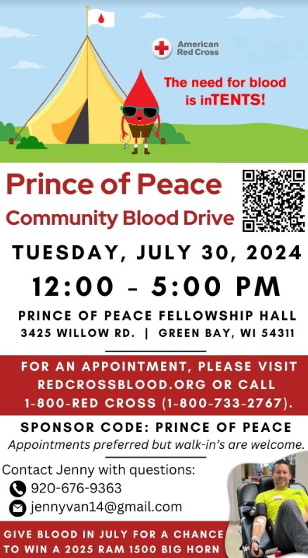 For an appointment, please visit redcrossblood.org or call 1-800-RED CROSS (1-800-733-2767). The sponsor code is: Prince of Peace.
