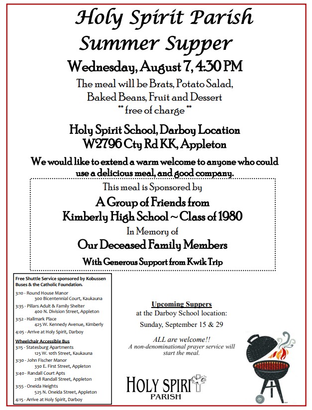 As with each summer, our suppers will be on Wednesdays at 4:30pm. Beginning in September, the suppers will return to Sundays at 4:30 p.m. at the same location.