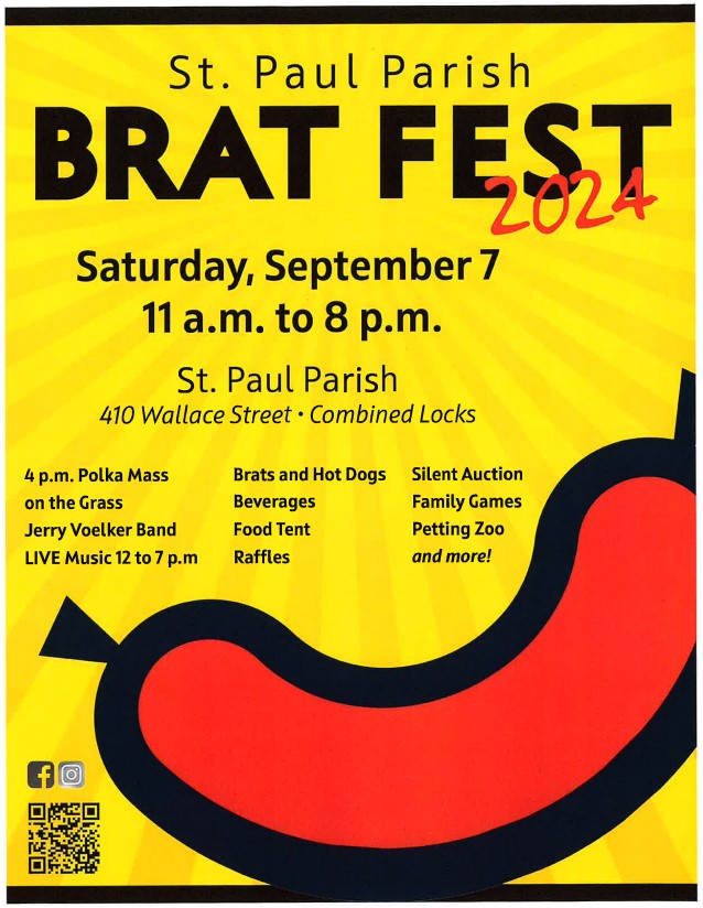 St. Paul Parish (located on Wallace Street in Combined Locks) is having their annual Brat Fest on September 7th. This is open to the public from 11 a.m. until 8 p.m. Come and enjoy a a great meal featuring traditional brats or spicy chicken brat or hot dog, beans and chips for only $5.00! Snacks and beverages are also available for purchase. There will be live music and children’s games throughout the day. A Polka Mass will be held outdoors at 4 p.m.