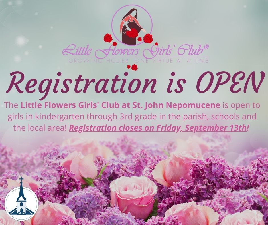 Registration is currently open through Friday, September 13th for the Little Flowers Girls’ Club at St. John Nepomucene! Little Flowers is open to girls in grades kindergarten through 3rd in the parish, schools and the local area.