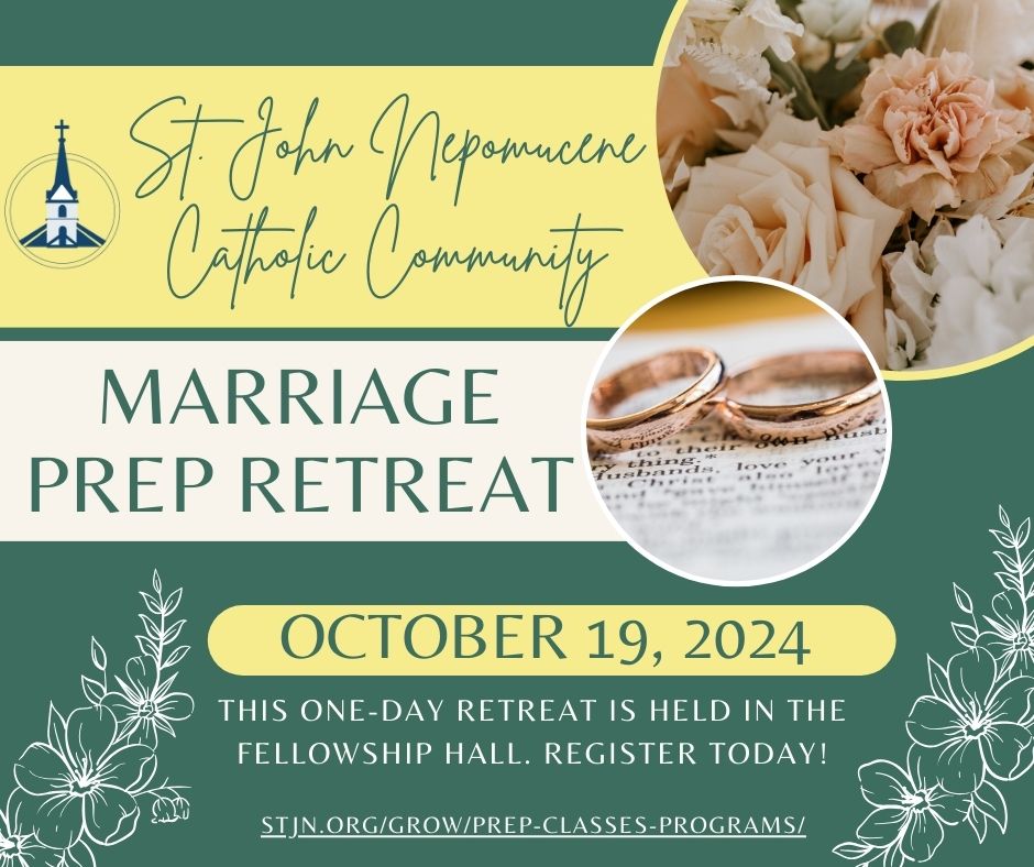 St. John Nepomucene’s fall Marriage Prep Class will take place on Saturday, October 19th in the Fellowship Hall beginning at 8:30 a.m. and ending with the group attending the 4:30 p.m. Mass.