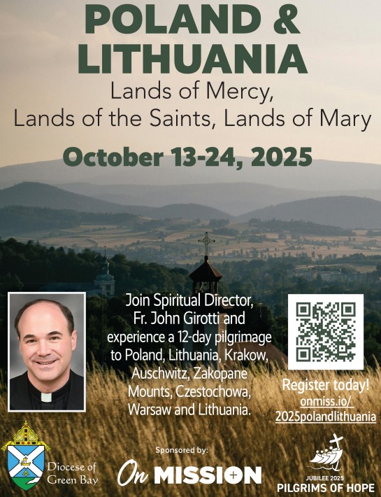 All are welcome to join Spiritual Director, Fr. John Girotti and experience a 12-day pilgrimage to Poland, Lithuania, Krakow, Auschwitz, Zakopane Mounts, Czestochowa, Warsaw and Lithuania from October 13th through October 24, 2025.