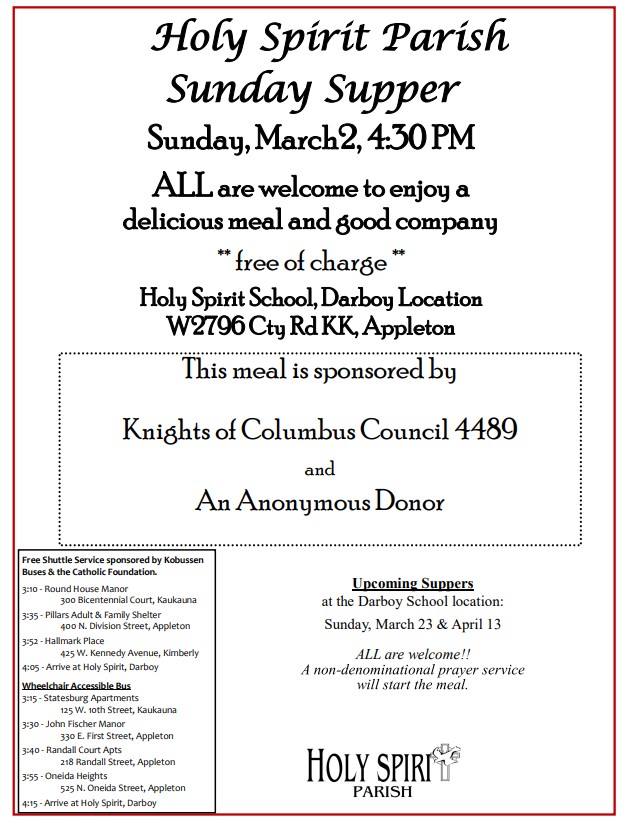 All are welcome for a dine-in meal at the Darboy School located at W2796 County Rd KK in Appleton (Darboy).