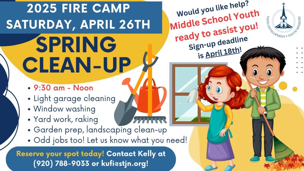 Please contact Kelly in the Faith Development office today at (920) 788-9033 or via email at: kufi@stjn.org. The deadline for sign up is Friday, April 18th.