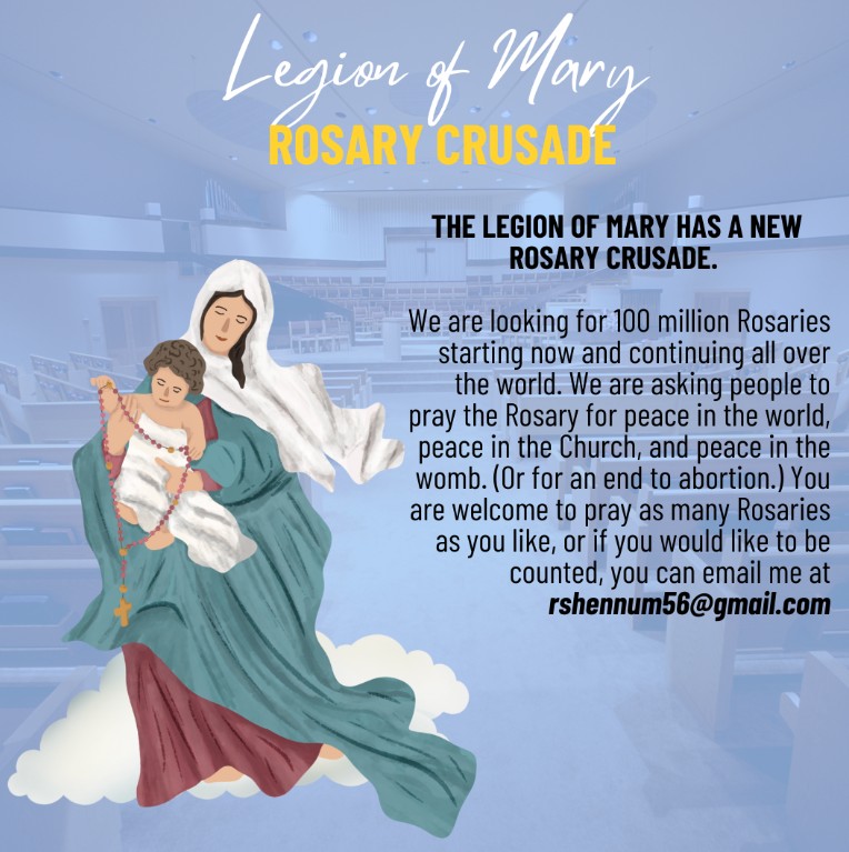The Legion of Mary has a new rosary crusade! You are welcome to pray as many Rosaries as you like, or if you would like to be counted, you can email me at rshennum56@gmail.com.