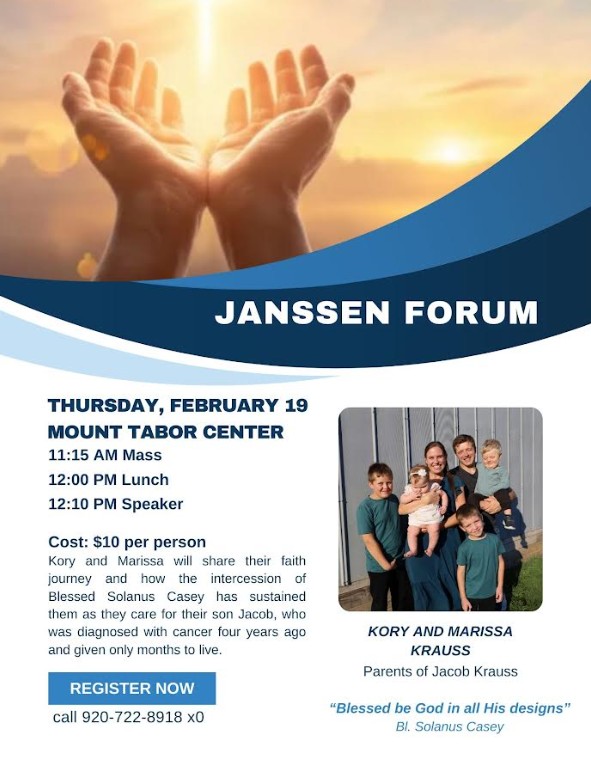 Join us for the Janssen Forum Luncheon Speaker Series, held on Thursday, February 19th. Our guest speakers, Kory and Marissa, will share their faith journey and how the intercession of Blessed Solanus Casey has sustained them as they care for their son Jacob, who was diagnosed with cancer four years ago and given only months to live.
