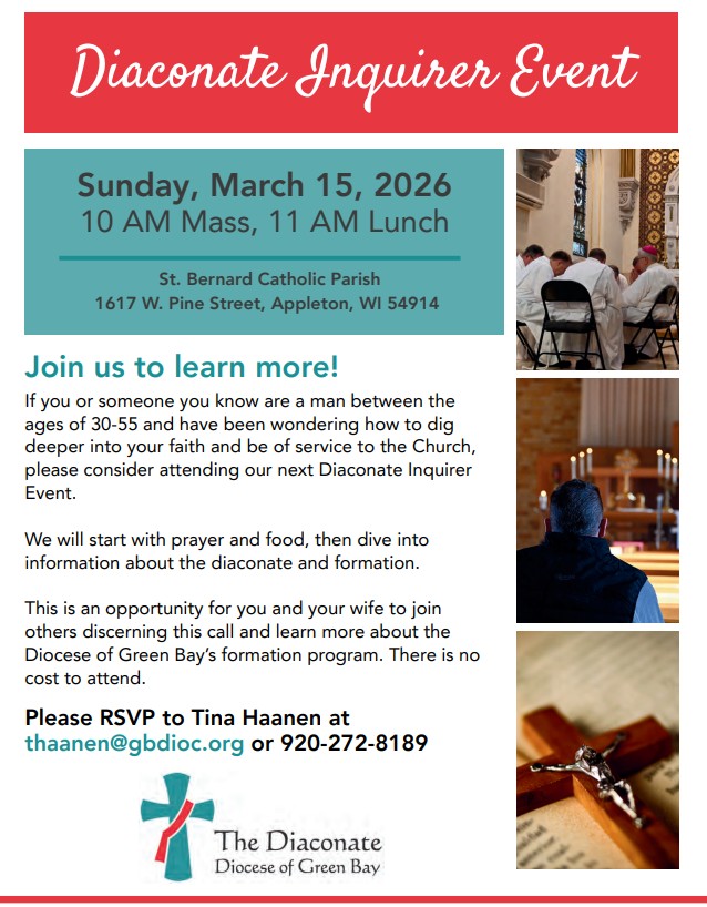 Posted on February 25, 2026 by SarahDiaconate Inquirer Event – March 15th Diaconate Inquirer Event – March 15th Please RSVP to Tina Hannen at thaanen@gbdioc.org. Related