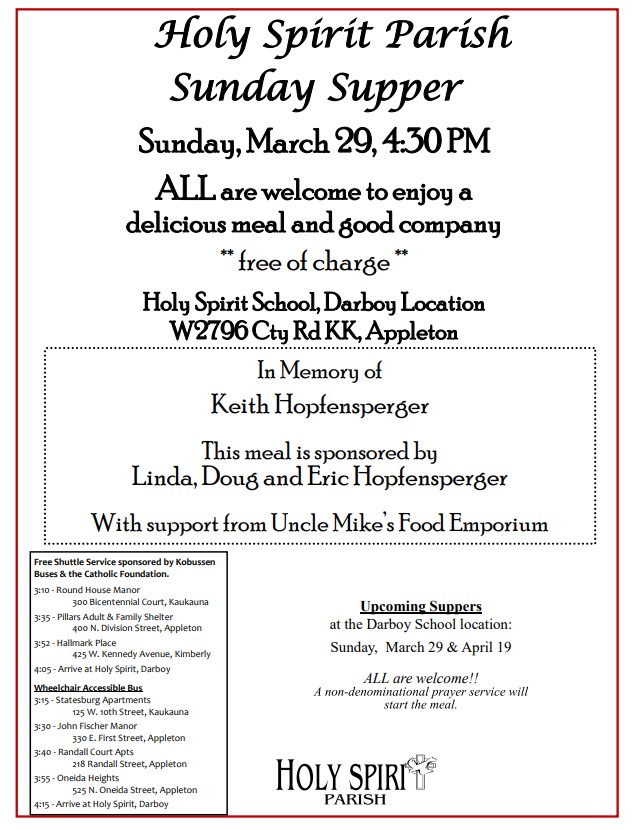 Holy Spirit Parish Sunday Supper – March 29th