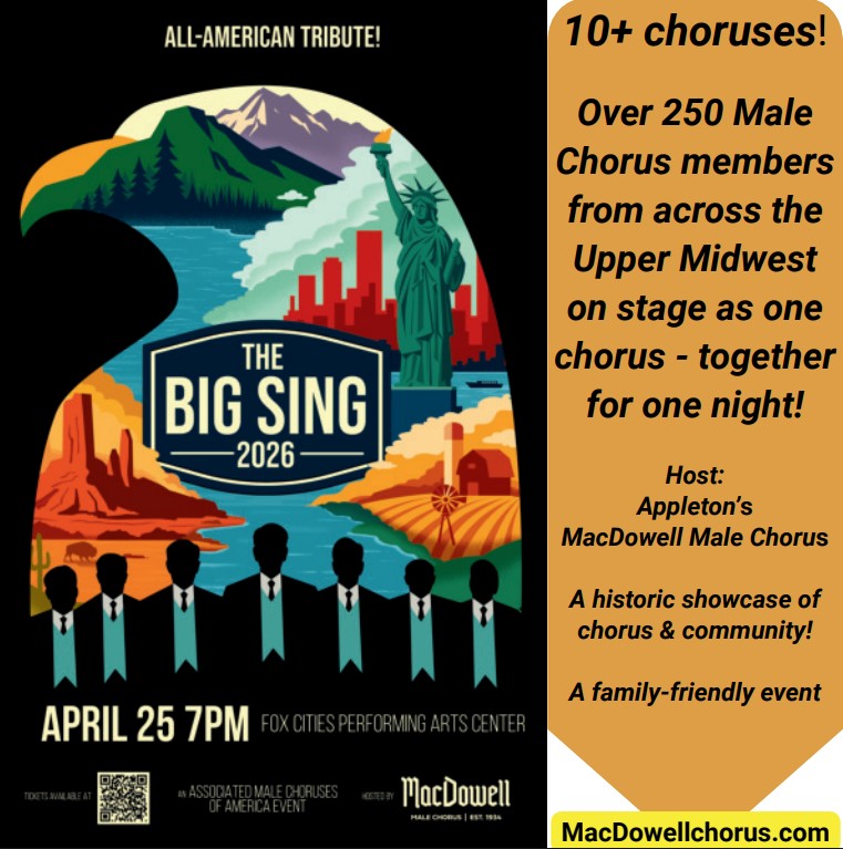 At 7:00 pm Saturday, April 25th, the Fox Cities Performing Arts Center (P.A.C.) in Appleton will resonate with the powerful harmonies of male voices from across the Upper Midwest as the BIG SING 2026 takes center stage. This highly anticipated choral event—hosted by the Appleton MacDowell Male Chorus—promises an evening of uplifting, community-focused music in the heart of the Fox Cities. This is a chance to experience the power and richness of male choral singing within one of northeastern Wisconsin’s premier performing arts venues, an ideal setting for this large-scale choral production!