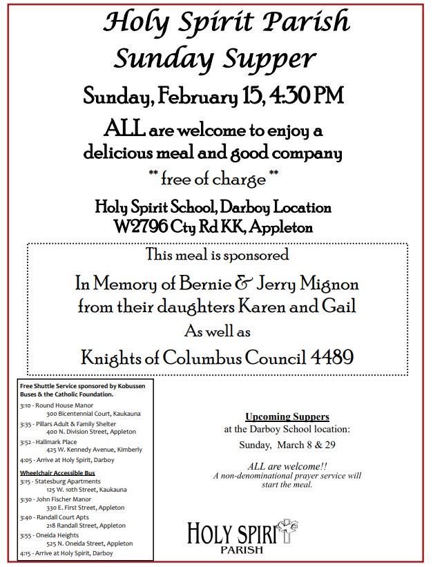 All are welcome for a dine-in meal at the Darboy School located at W2796 County Rd KK in Appleton (Darboy).