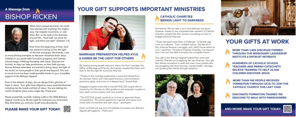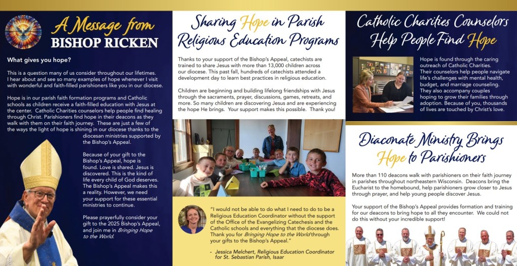 The Bishop’s Appeal is a stewardship opportunity for each of us to reach out to thousands of people in search of Jesus’ love. Each gift given supports the ministries of the Diocese of Green Bay which serve our parishes, Catholic schools, and communities. Your gift truly helps bring the heart and hands of Christ to our children, young adults, families and neighbors here in northeastern Wisconsin. Click here to view the brochure.