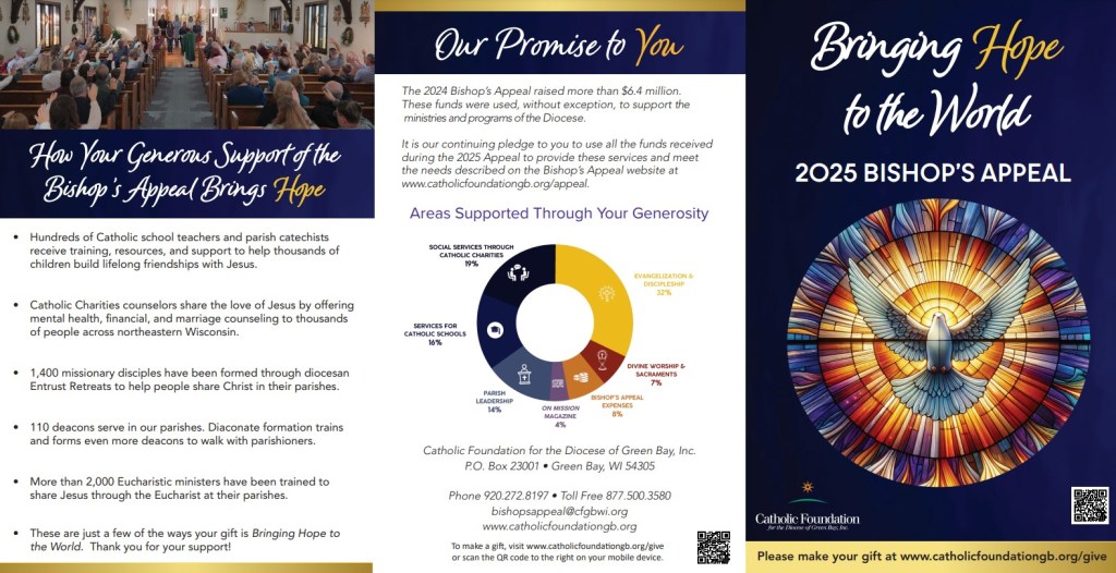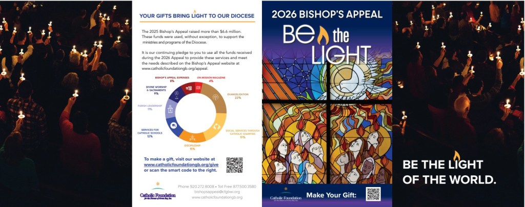 To learn more about the Bishop’s Appeal or to make a gift, please contact the Bishop’s Appeal office at (920) 272-8123, bishopsappeal@gbdioc.org or to give online.