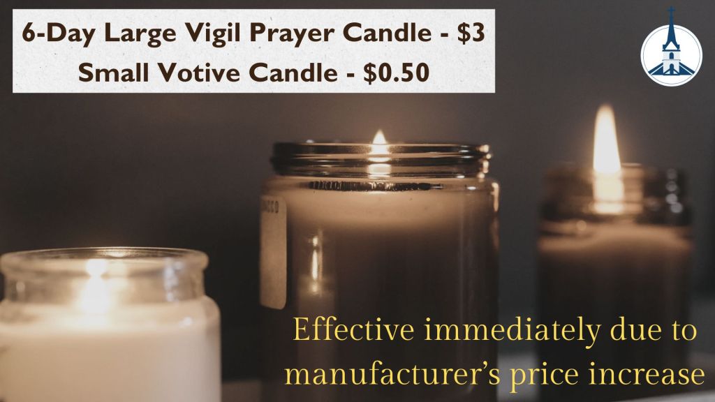 Effective immediately: Due to manufacturer’s price increase, the 6-day large vigil prayer candles will increase from $2 to $3 per candle. The small votive candles will remain the same at $0.50 each.