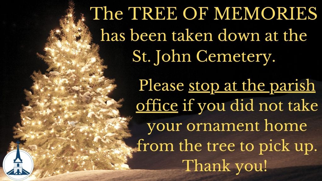 If you did not take your ornament off the tree, the ornaments will be at the parish office on Tuesday, January 6th for you to stop by and take home with you. The parish office is open Monday through Friday from 8 a.m. until 4 p.m. Thank you.