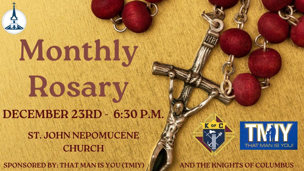 That Man Is You (TMIY) and the Knights of Columbus are sponsoring the Monthly Rosary. This event is open to all, including children, and will occur on the fourth Tuesday of each month. Please join us on Tuesday, December 23rd at 6:30 p.m. in church. Extra rosaries will be available and participants are welcome to bring an intention to share with the group.