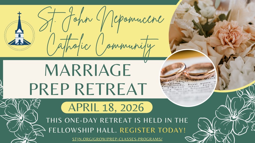 St. John Nepomucene’s Spring Marriage Prep Class will take place on Saturday, April 18th in the Fellowship Hall beginning at 8:30 a.m. and ending with the group attending the 4:30 p.m. Mass. To learn more or how to register, please click here.