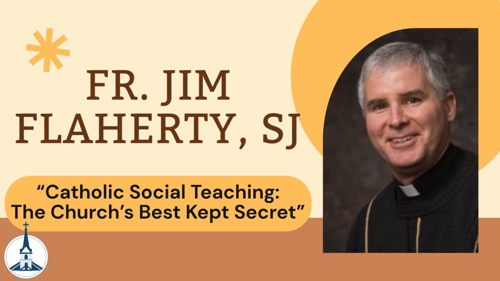 All are welcome to join us on Thursday, March 12th at 6:00 p.m. in the Atrium at St. John Nepomucene! We are so excited to welcome our speaker, Fr. Jim Flaherty, SJ, who will be presenting “Catholic Social Teaching: The Church’s Best Kept Secret”.