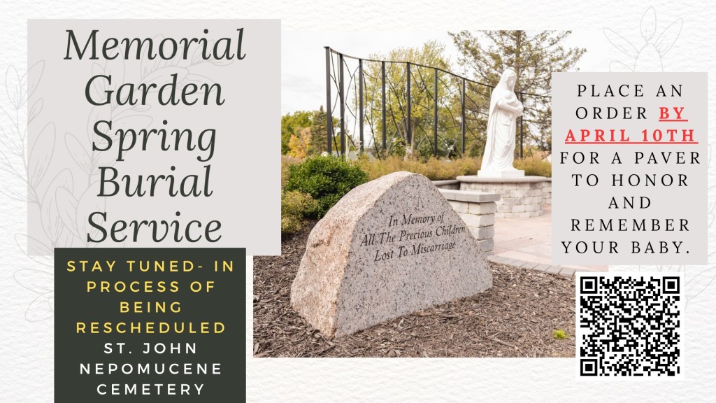 The Memorial Garden and burial site in the St. John Cemetery provides a peaceful place for mourning, reflection and remembering our angel babies. Dedication ceremonies will occur twice a year on the last Wednesday in April and the last Wednesday in September.