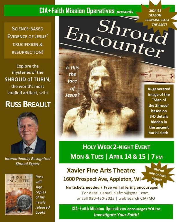 SHROUD ENCOUNTER, the final presentation in CIA-FMO’s 2024-2025 Investigate Your Faith series, is set for HOLY WEEK, Monday, April 14th and Tuesday, April 15th at 7 p.m. at the Xavier Fine Arts Theatre in Appleton.