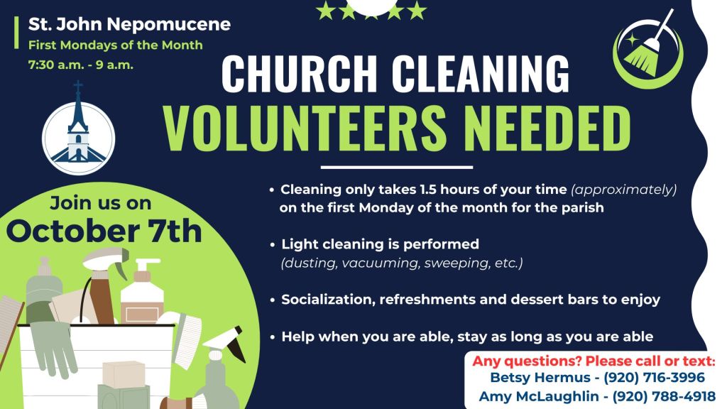 St. John Nepomucene Church Cleaning occurs on the first Monday of the month (unless it falls on a holiday, then it is held on the following Monday). We are looking for more volunteers who would like to donate their time and help us clean!