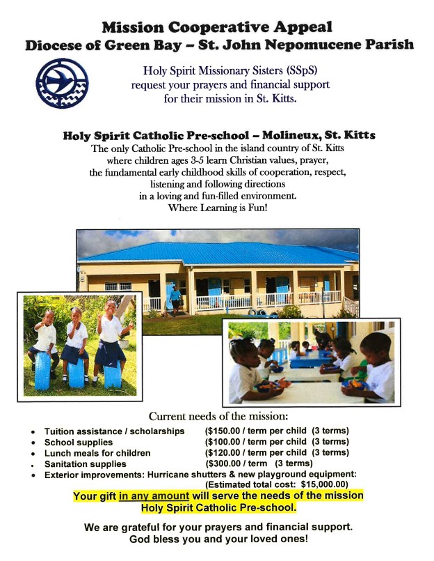 Sr. Mary Miller, SSpS from the Holy Spirit Missionary Sisters in Illinois will be at our parish on July 27th and July 28th to discuss their current needs in regards to the Mission Cooperative Appeal.
