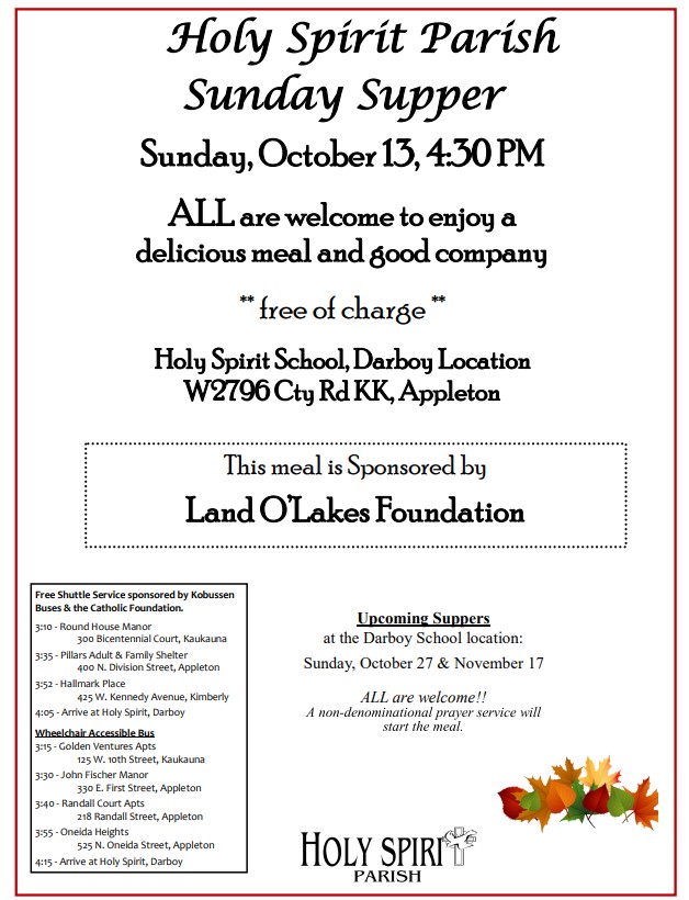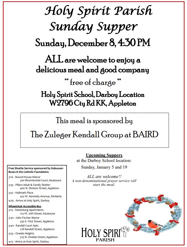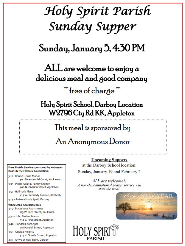 All are welcome for a dine-in meal at the Darboy School located at W2796 County Rd KK in Appleton (Darboy).
