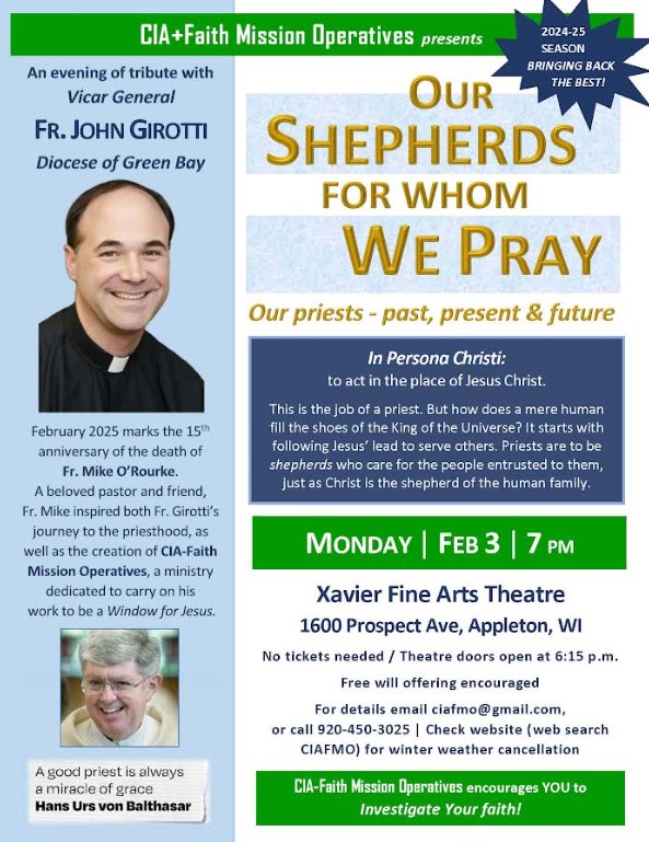 The new year begins on Monday, February 3rd at 7 p.m. at the Xavier Fine Arts Theatre when CIA-Faith Mission Operatives is excited to present “OUR SHEPHERDS FOR WHOM WE PRAY … Our priests – past, present & future”. This event brings back our own Fr. John Girotti, vicar general for the Diocese of Green Bay and one of our most popular past presenters.