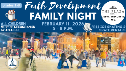 Join us for Faith Development Family Night on February 11 between 5-8 PM at the Plaza in Neenah for Free Icd Skating & Skate Rentals. Bring the entire family for an evening of fun with other families from our parish.