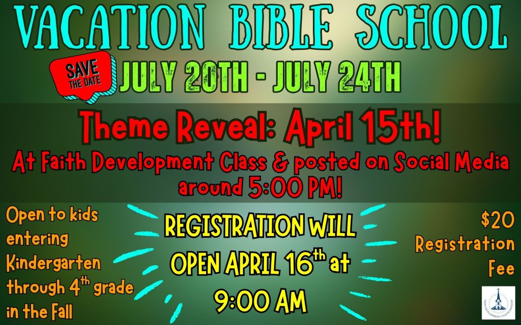 Registration for VBS 2026 will open Thursday, April 16th at 9:00 AM! Watch for links to be sent out then!