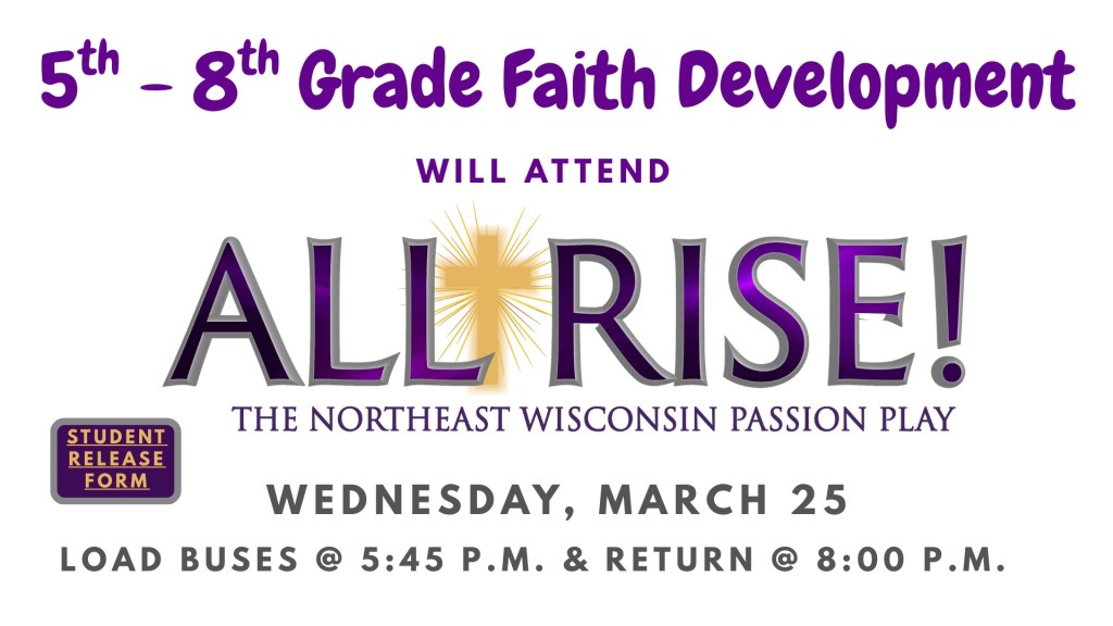 Our 5th through 8th grade students will be attending the All Rise – The Northeast Wisconsin Passion Plan for their scheduled class night on March 25th.